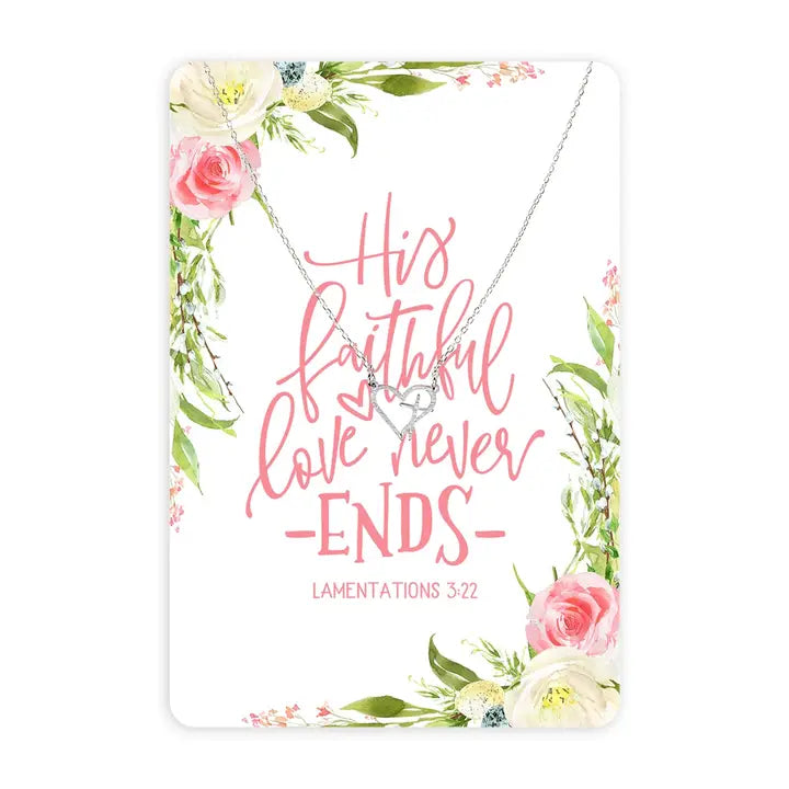 His faithful love never ends, this dainty Silver Heart and Cross Necklace comes on a fun, metal keepsake card that can be used as a bookmark or decoration.