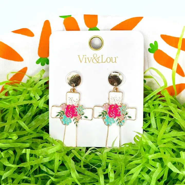 These earrings feature an enamel floral cross design with gold accents! You will find yourself reaching for this pair to wear day after day!