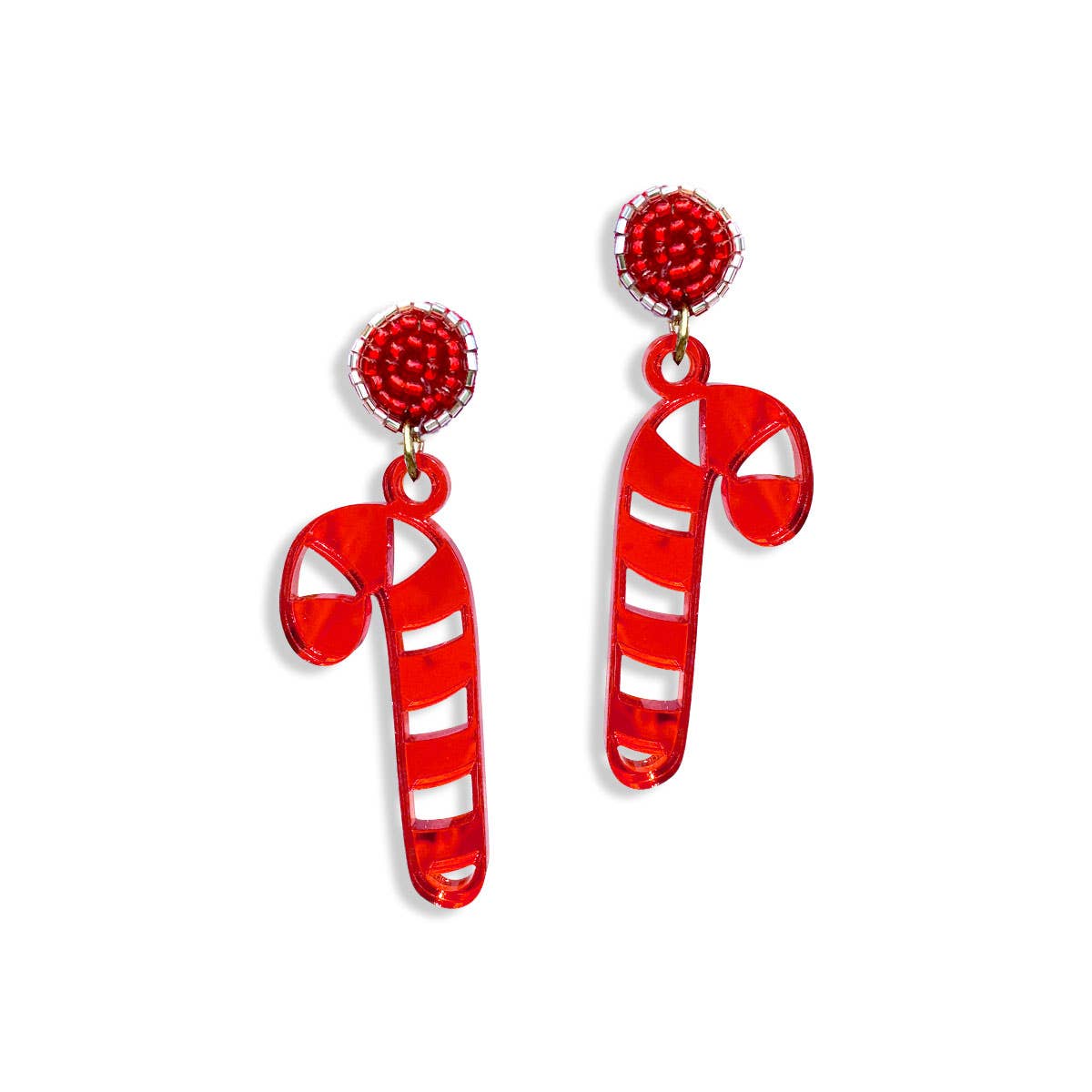 Fun and festive, these candy cane inspired acrylic earrings are a cute addition to any holiday look! 2" H Red Mirrored Acrylic Beaded Post Earring Designed and Assembled in the USA