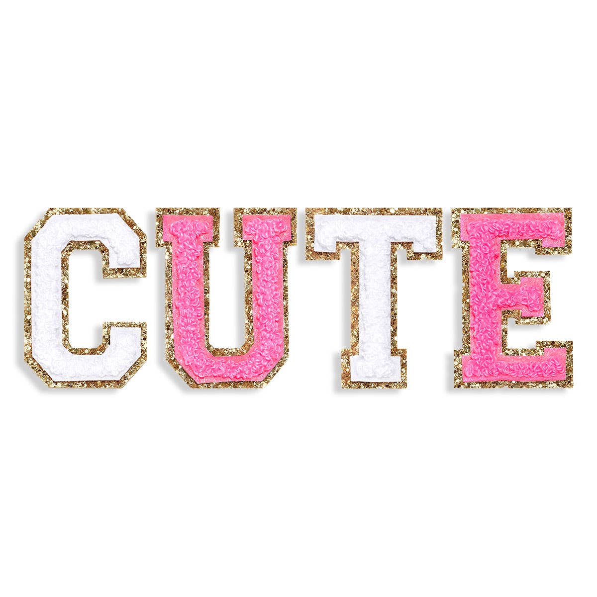 2" H x 2” W (Varies by Letter) Plush Chenille Motif & Gold Glitter Border Iron On, Sew On or Stick On 3M Stick-On Backing 1 of Each Letter Patch Comes Unassembled