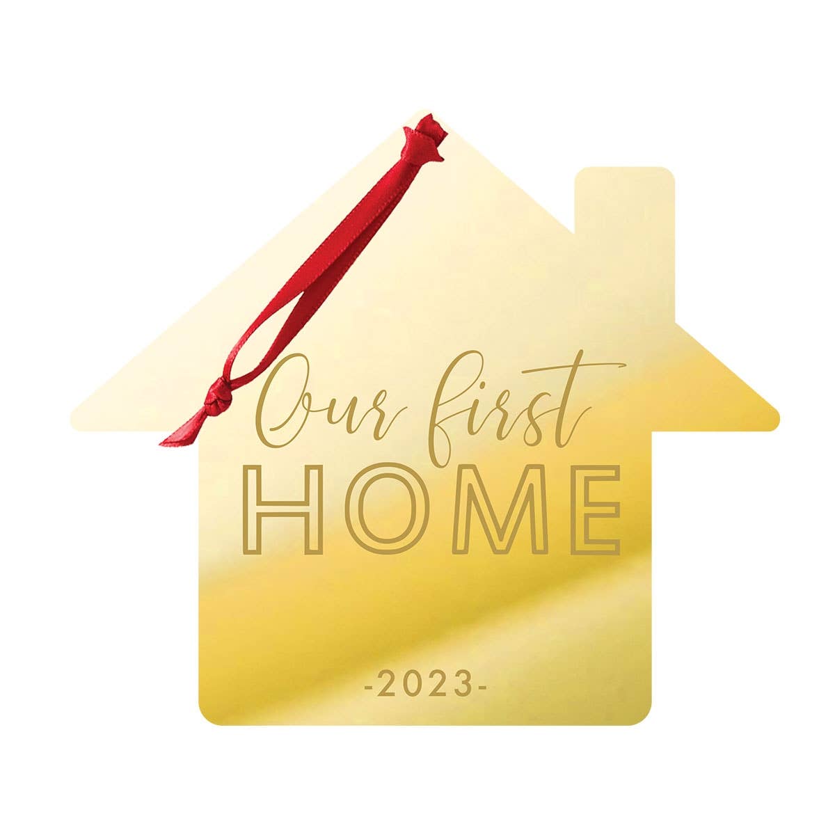 This ornament is the perfect addition to any holiday decor! 4.5" H Gold Mirror Acrylic Includes Red Satin Ribbon for Hanging