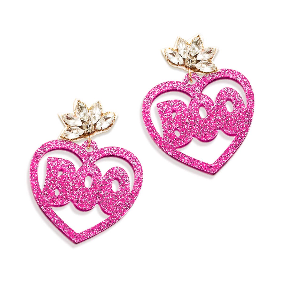 *Original Price: $12.50* Spook-tacular and fun, these statement earrings are sure to add an eye-catching touch to any Halloween ensemble! 2.5" L Pink Glitter Acrylic Design Crystal Post Earrings Designed and Assembled in the USA