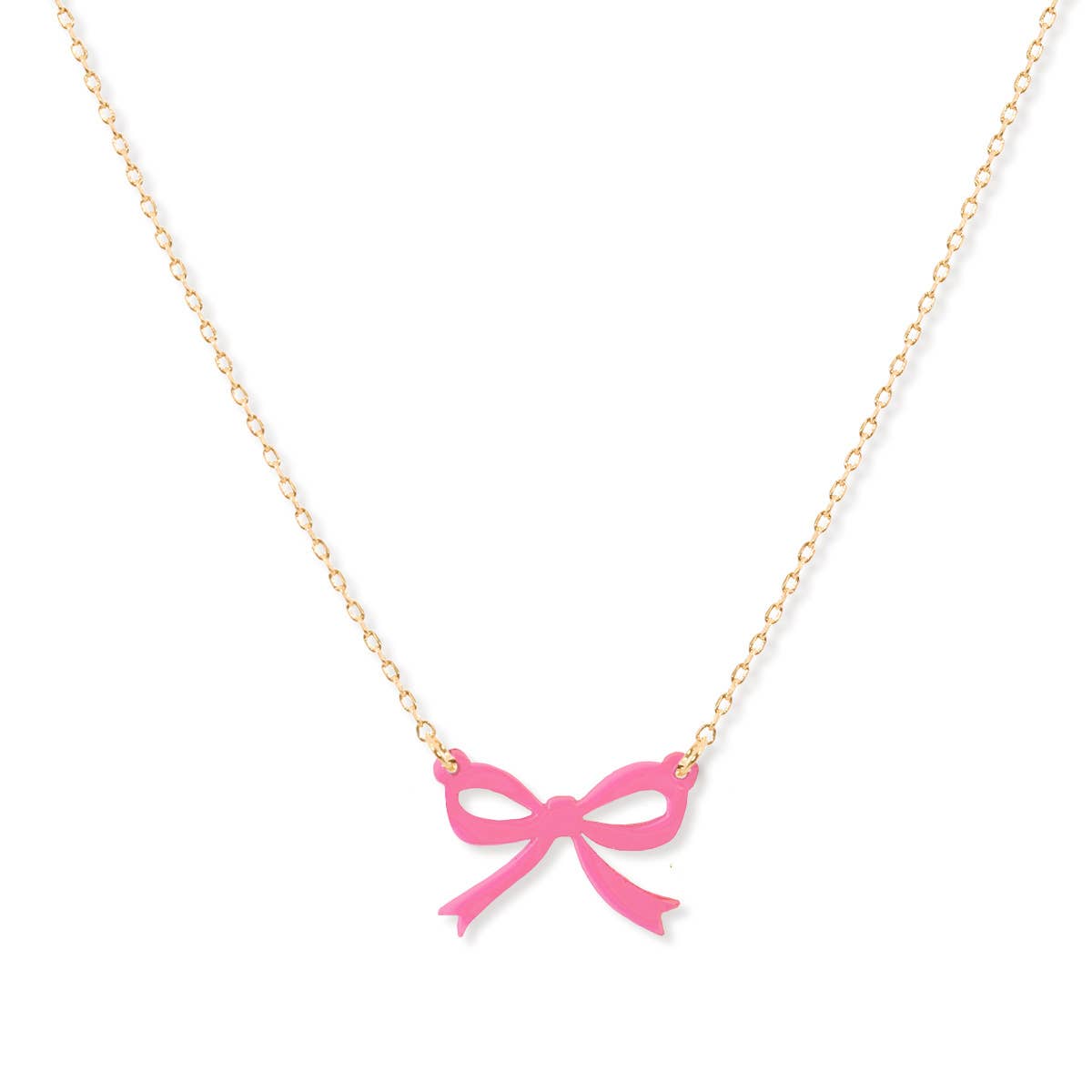 Elevate your style with this simple necklace adorned with a trendy bow charm, adding a touch of fun to your ensemble! 17-20" Adjustable Necklace 2" Acrylic Bow Design Gold Toned Metal Coordinating Bracelet Available
