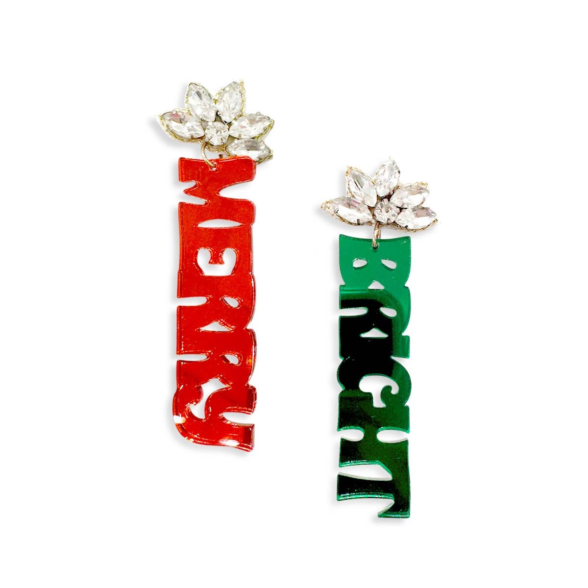 Fun and festive, these acrylic statement earrings are a cute addition to any holiday look! 2.5" Red & Green Mirrored Acrylic Crystal Post Earring Designed and Assembled in the USA