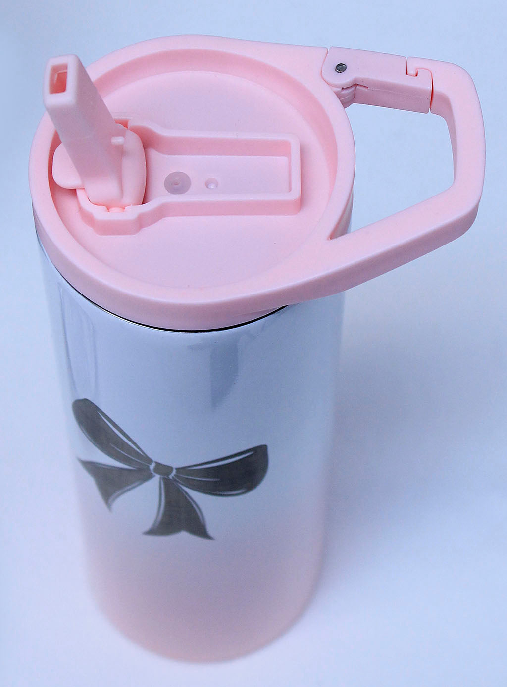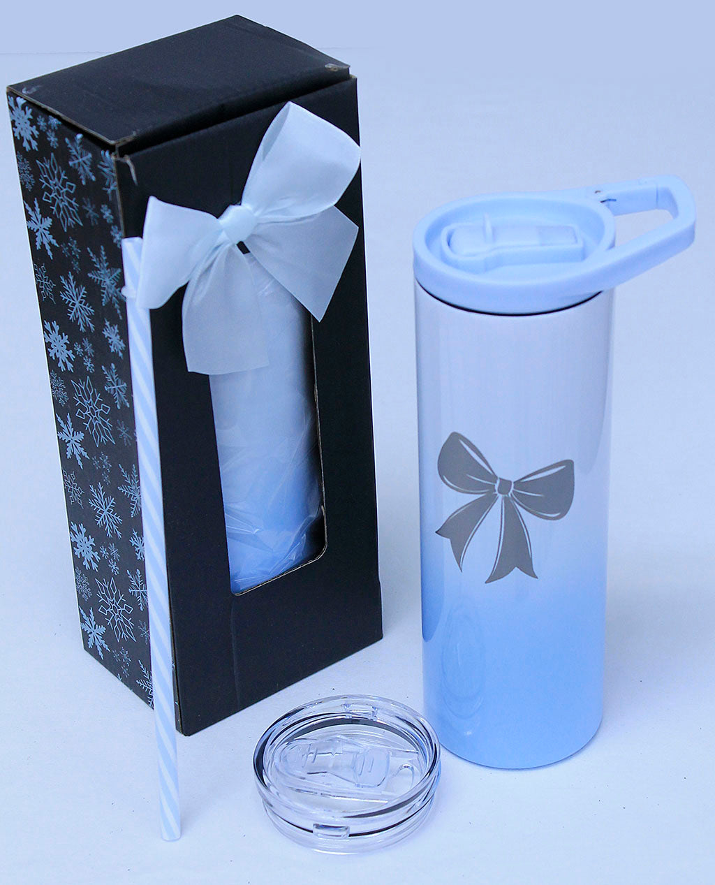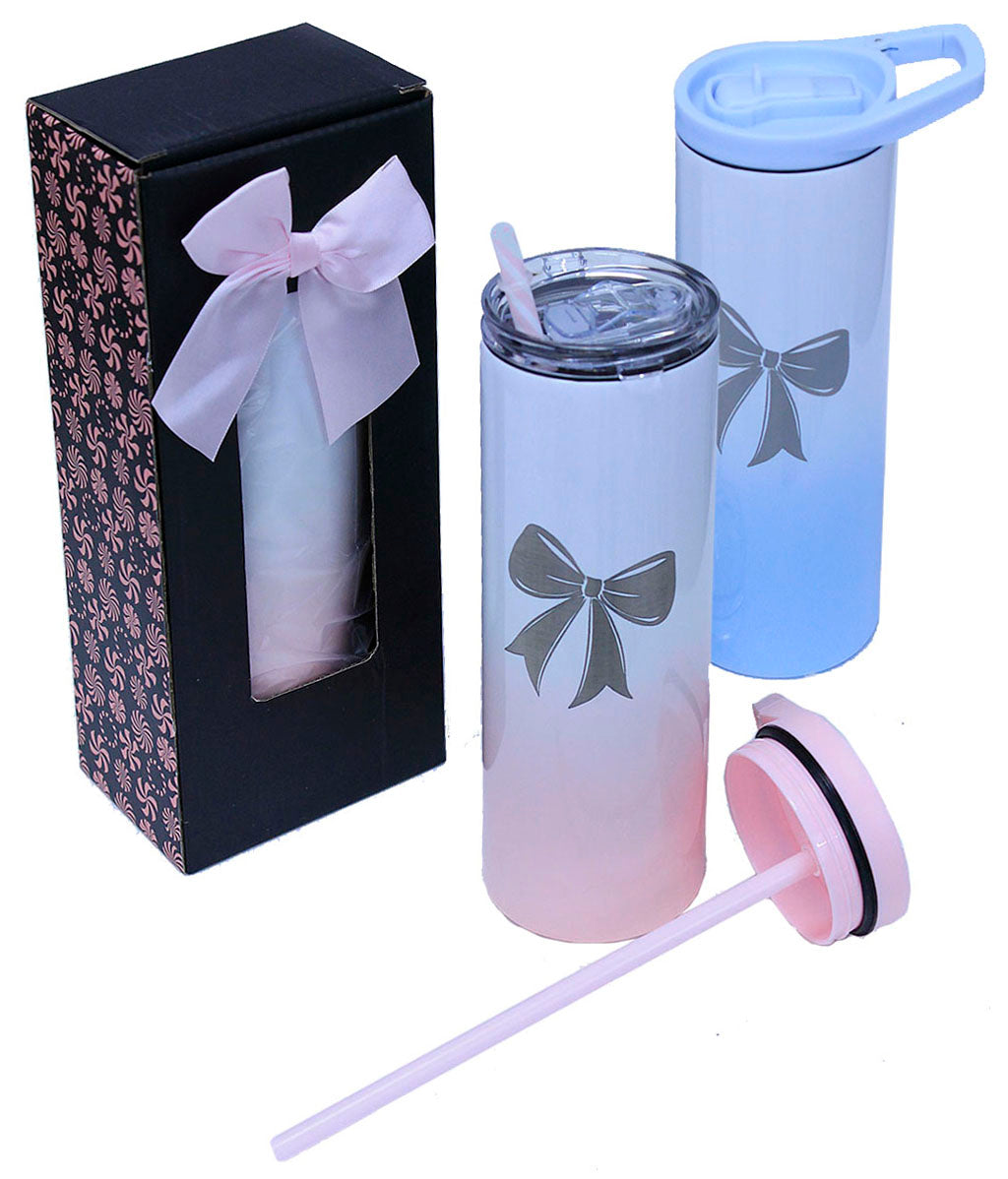 NEW & EXCLUSIVE by Vivid Impressions. Sip in style with this tall beautifully colored ombre' pink or baby blue on a 20 oz stainless insulated skinny tumbler. A thin design tumbler that fits perfectly in your hands as well as any car cup holder. Comes decorated with a large laser-engraved bow design front and center. Also comes with a flip straw lid, hang up handle, a clear slide lid top and matching candy cane straw. A perfect gift item with it's attractive silk bow attached picture box. Adds a pop of personality to any beverage experience. This tumbler keeps your drinks hot or cold, ensuring every sip is just as refreshing as the first. 20 oz. Insulated Stainless Steel Laser-Engraved Design.