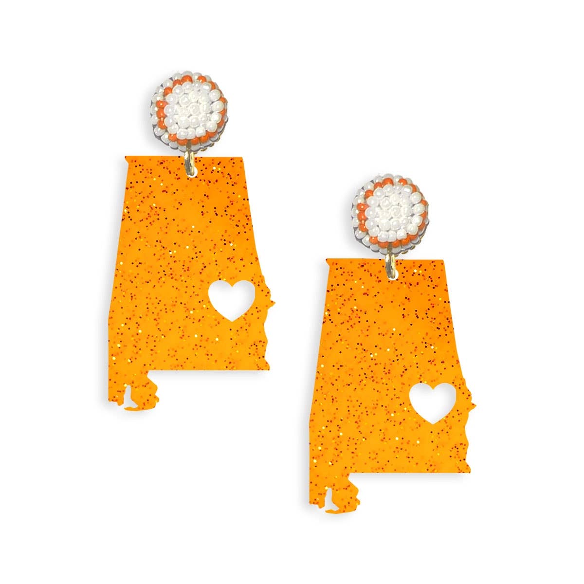 Rep your state with these fun Alabama inspired earrings, they are sure to make a STATEment! 2.5" H Orange Glitter Acrylic Beaded Post Earring Designed and Assembled in the USA