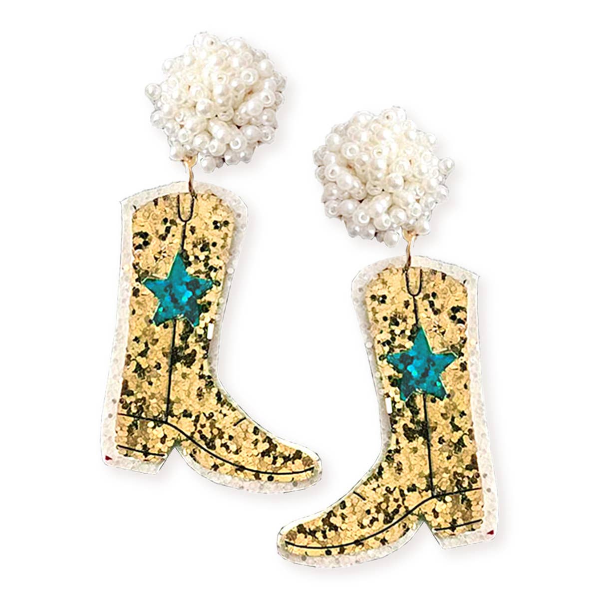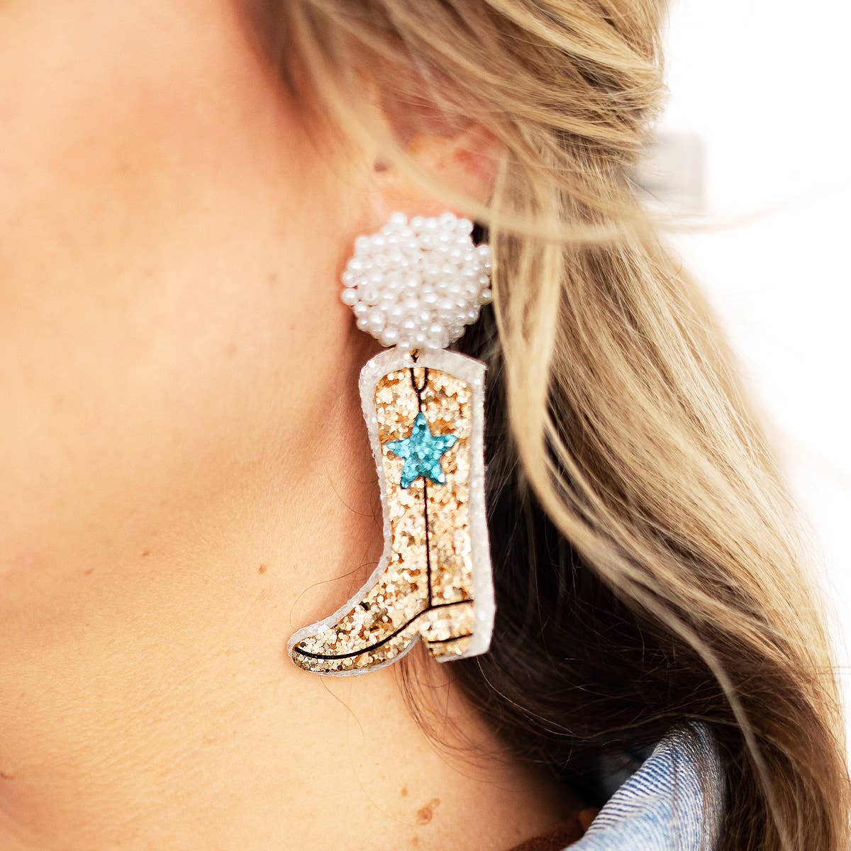 Giddy up, these statement earrings add a fun touch to any outfit and are perfect for wearing on a girls' trip! 2" H Thick Glitter Pearl Post Earrings