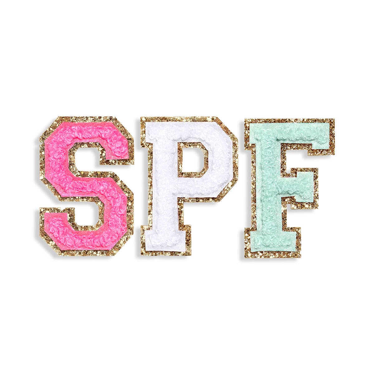 2" H x 2” W (Varies by Letter) Plush Chenille Motif & Gold Glitter Border Iron On, Sew On or Stick On 3M Stick-On Backing 1 of Each Letter Patch Comes Unassembled