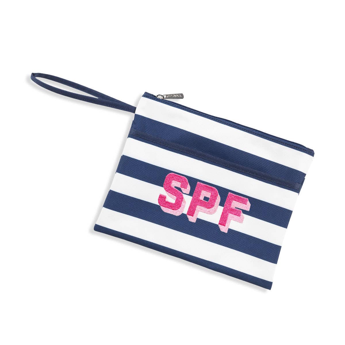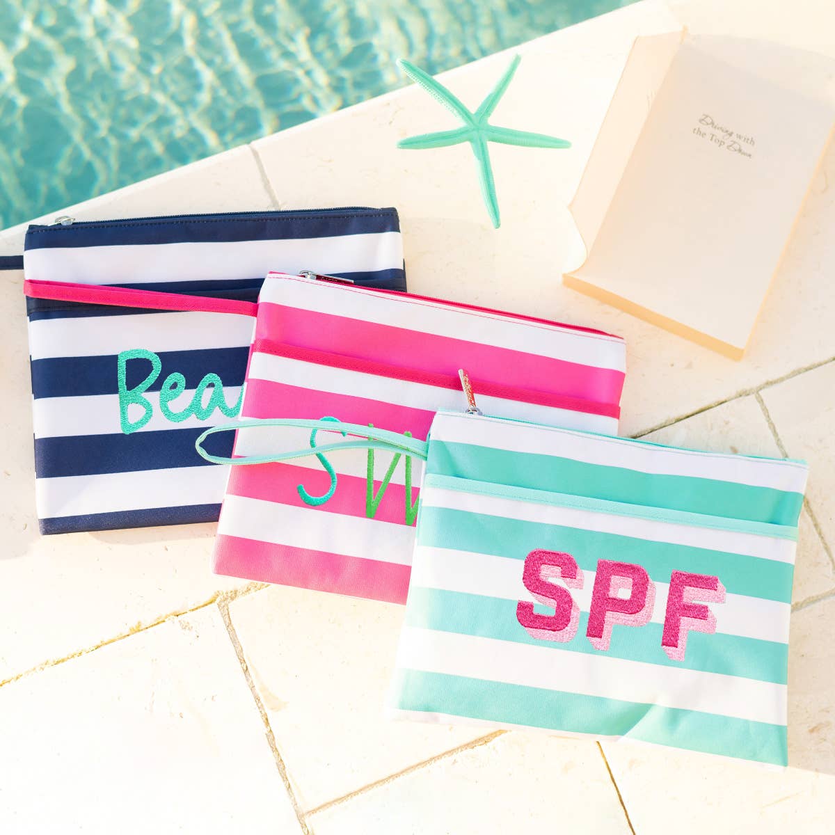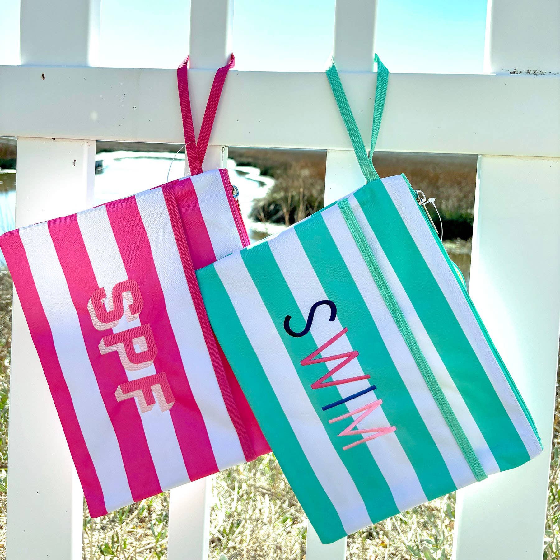 Keep all your little things secure in this everyday essential! The water-resistant lining also makes the Zip Pouch Wristlet is the best to store your swimsuit, accessories, cosmetics, and more! 11" L x .5" W x 8.5" H Polyester Embroidered Design Interior PEVA Lining Exterior Open Pocket Wrist Strap: .375" W x 11" Circumference Silver Toned Metal Hardware Zipper Closure Designed and Embroidered in the USA