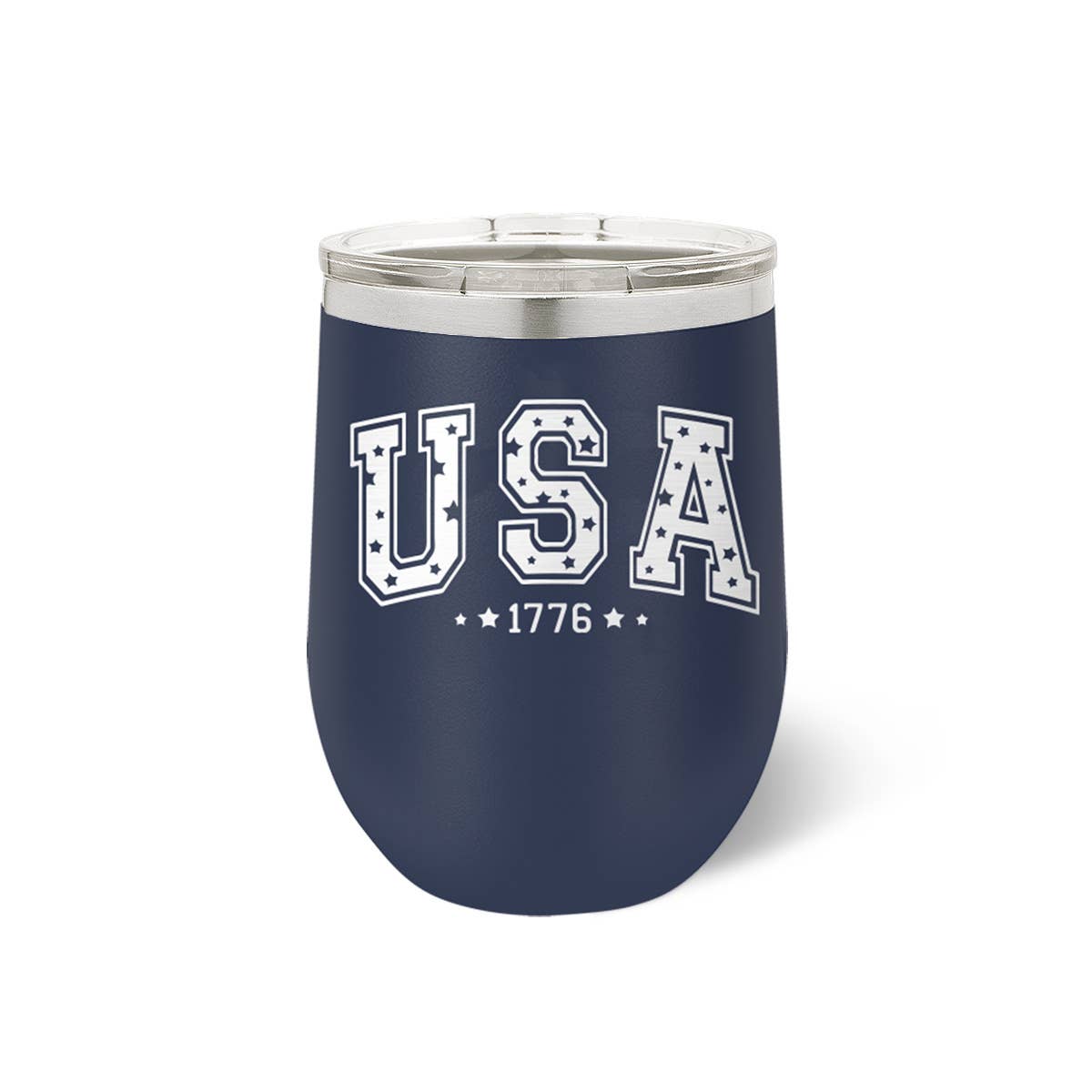 Celebrate the Fourth of July with this fun patriotic tumbler that is sure to keep your drinks cold or hot! Laser Engraved Design 12 oz. Powder Coated Insulated Stainless Steel Includes Clear Lid