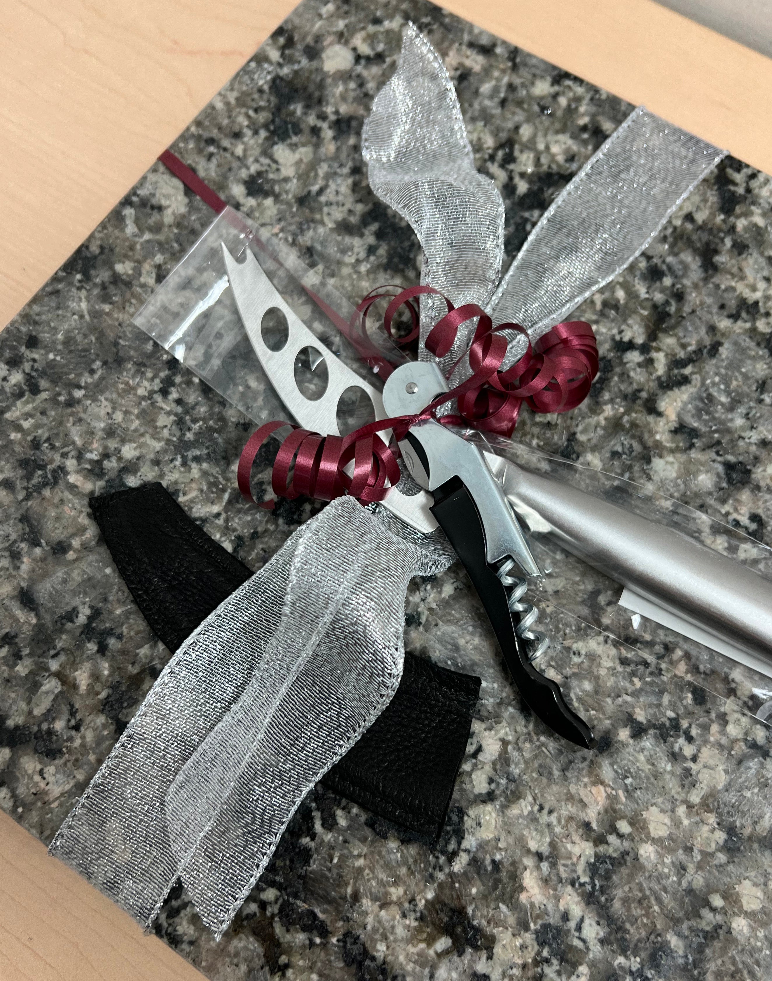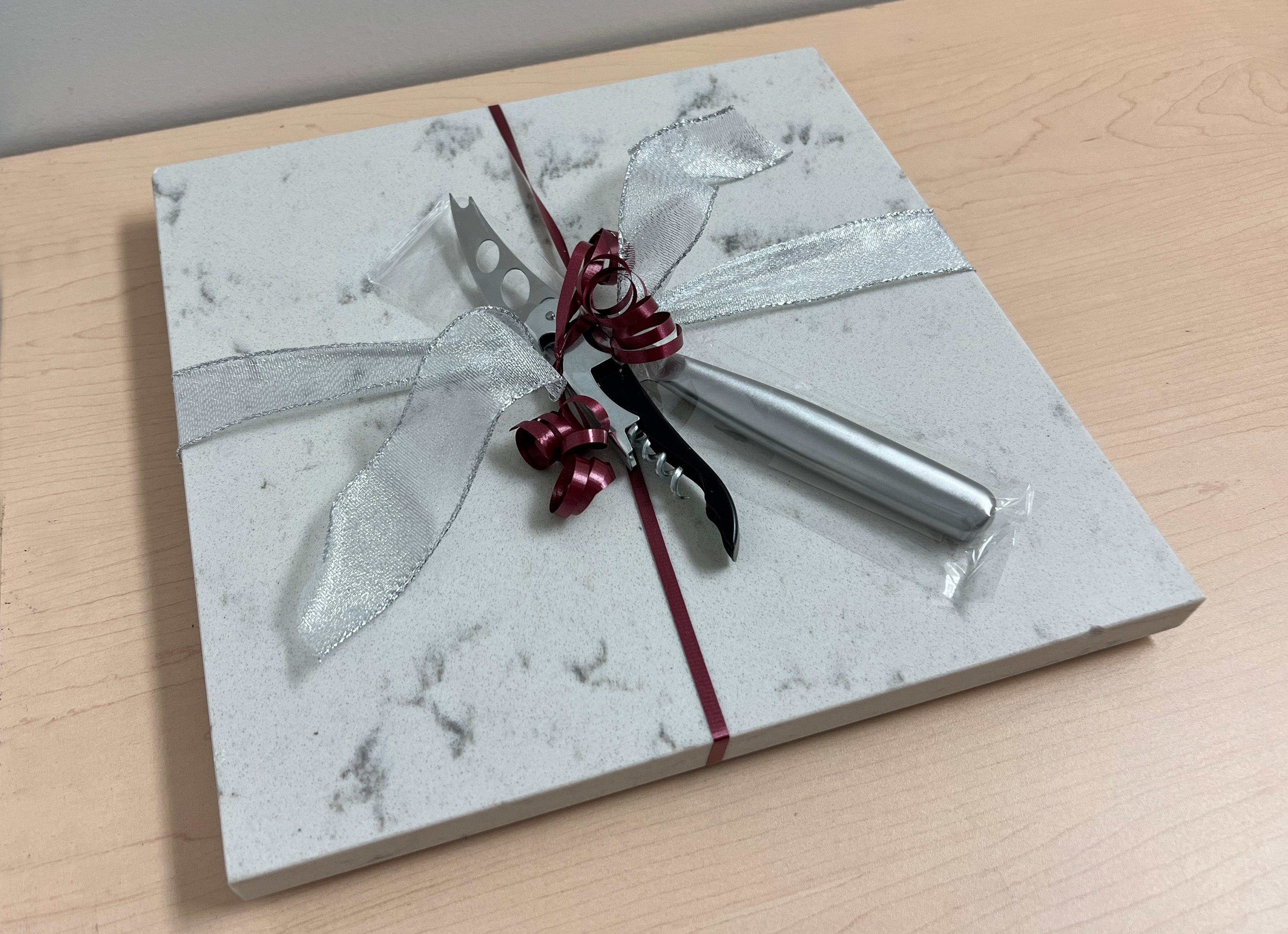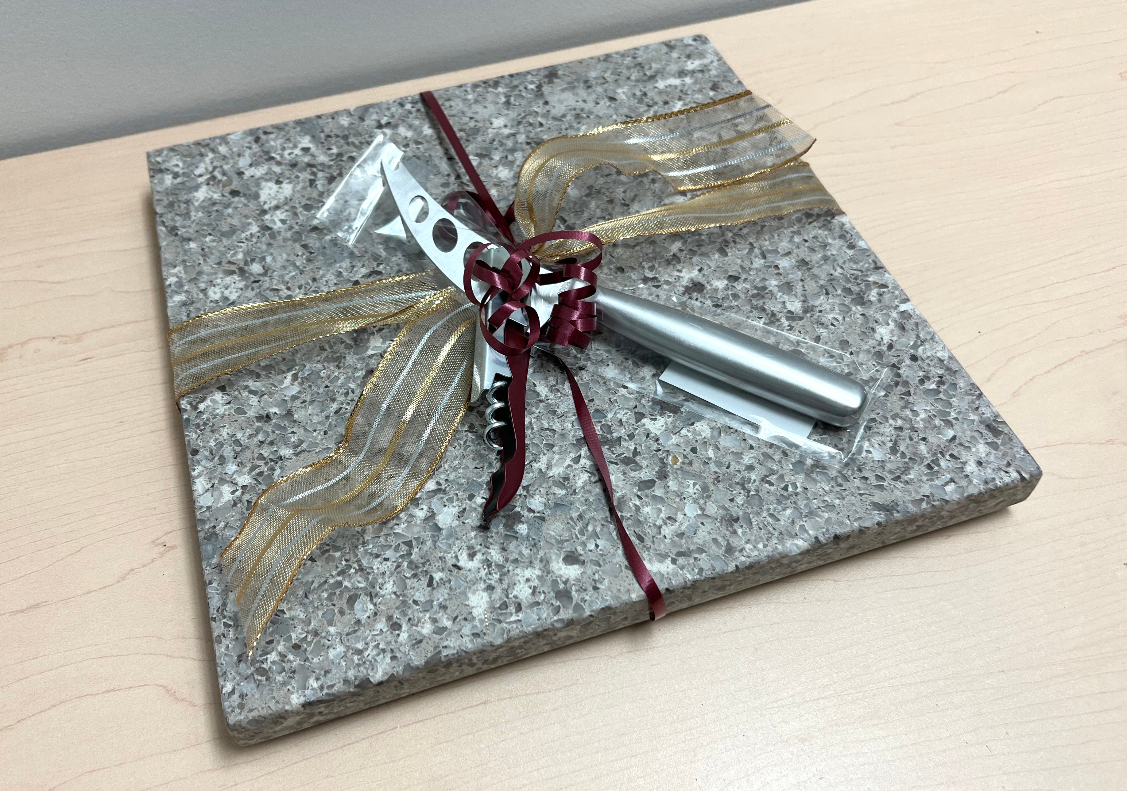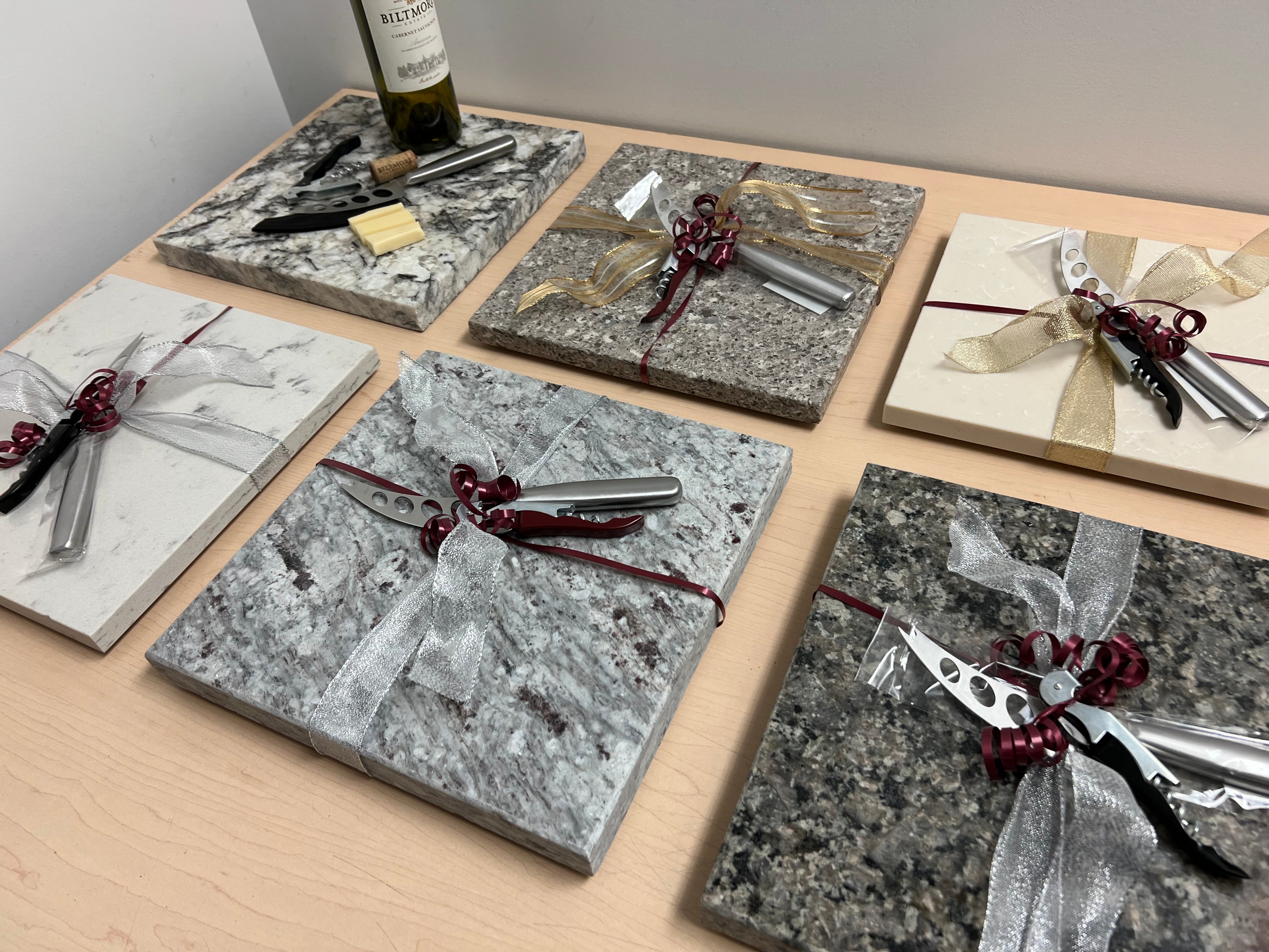 Genuine stone cheese boards made of a variety of granite, quartz and marble colors. This genuine stone charcuterie board comes with a sharp cheese knife with hand made leather sheath and wine bottle opener. Also ideal as a centerpiece pedestal. Sizes measure either 10" or 12" square with 4 heavy duty rubber feet to not scratch your counter tops. Thickness is between 3/4" and 1.25" thick and weighs between 10 and 18 lbs. Colors cannot be specific to photo since they are natural stone and colors within the stone will vary but will closely match the ordered color. The leather sheath comes in a variety of soft grains and textures.sharp 9" cheese knife included