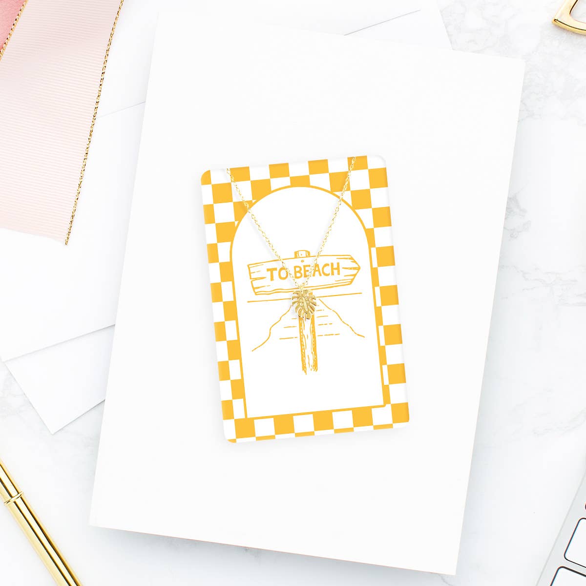 This keepsake card features a fun design, a positive message, and an adorable simple necklace. The keepsake card can be used as a bookmark, a fun piece of décor to add to your bulletin board or refrigerator, and as a daily reminder to make you smile. 16-18" Adjustable Chain Palm Leaf Pendant Gold or Rhodium Plated Brass Lead and Nickel Free Card Measurement: 2.5” x 3.75” H Designed and Printed in the USA