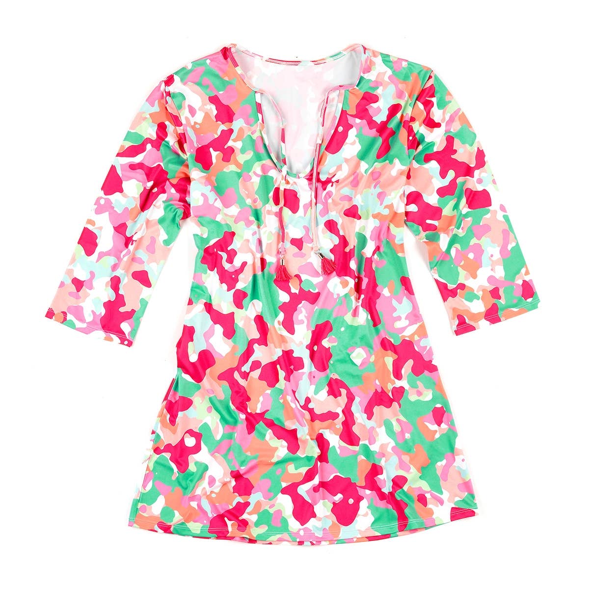 **Original Price: $17.50** This super cute Tunic not only looks great but feels great too! The fun pattern and easy pull-over design make this tunic ideal for shell hunting on the beach or walking on the boardwalk. Polyester/Spandex Blend 3/4 Sleeve Available in Sizes S/M(2-8), L/XL(10-16), and XXL(18-24) Decorative Tassel Ties Coordinating Beach Bag, Cooler Tote, & Beach Towel Available
